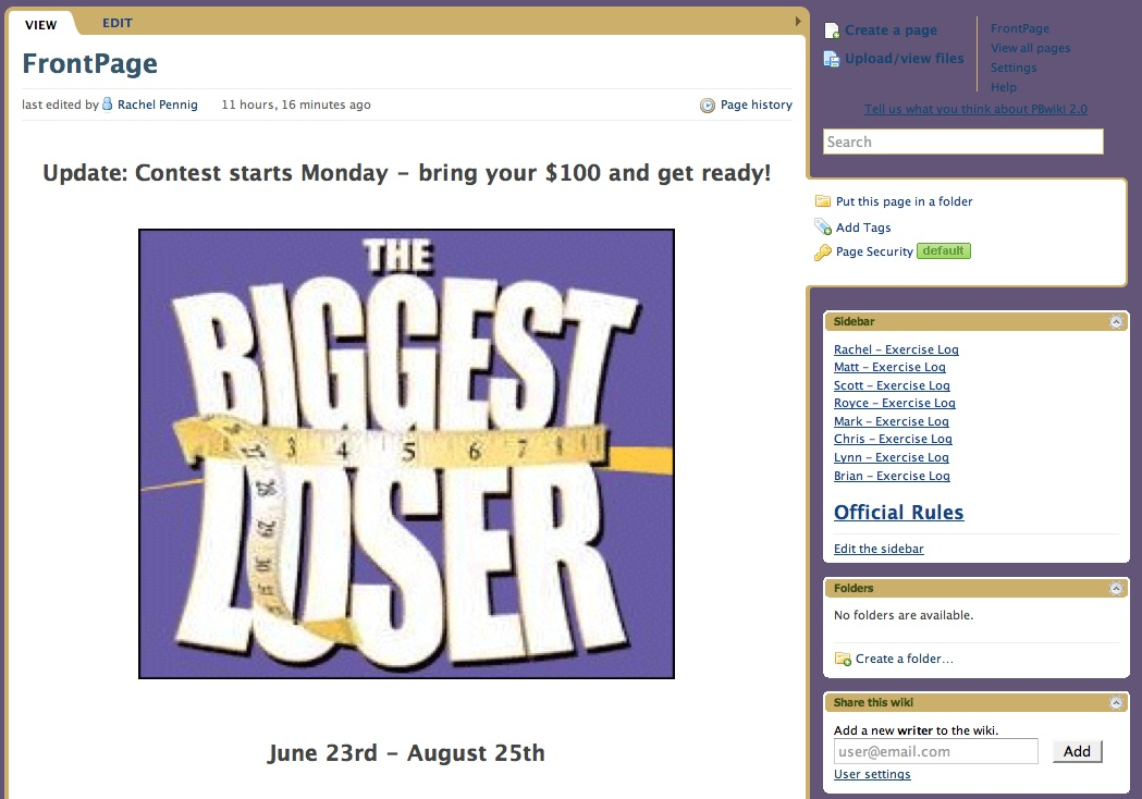 We wouldn’t be PBwiki if we didn’t somehow incorporate a wiki into this challenge. We use a wiki to track our progress, trash talk each other, and log our exercise goals and food intake.