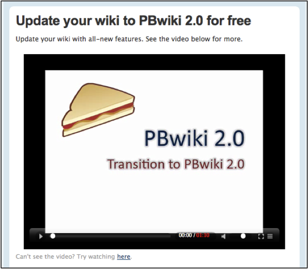 To update to PBwiki 2.0, go to WIKINAME.pbworks.com/migration.php (just replace WIKINAME with the name of your wiki) and follow the instructions on screen!