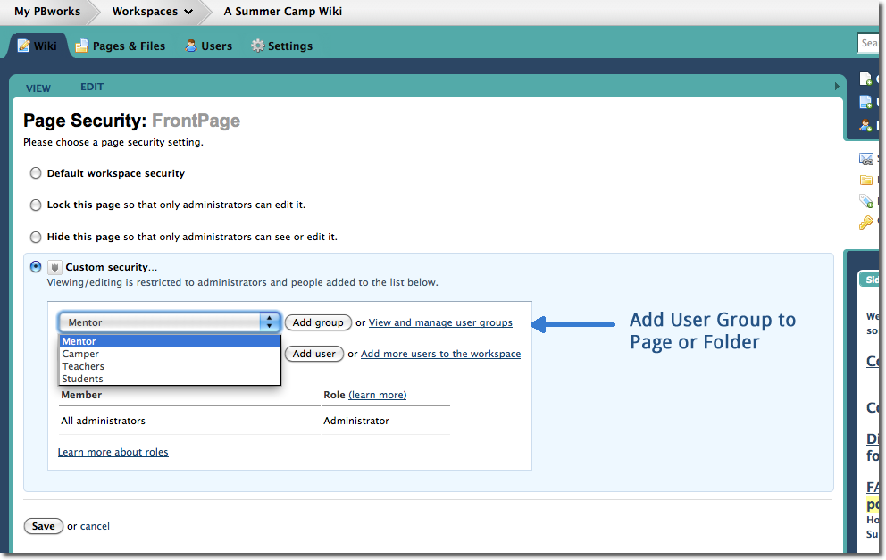 Earlier this year we surveyed the top 100 educators on PBworks and asked them how we could make their workspace even better. The number one request was USER GROUPS! Specifically people wanted to easily add the same group of users to a page or folder and make it easier to set page security.