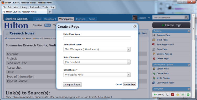 The new green Universal Action Button will appear on our main screens, like Workspaces and Everyone at the network level, and Pages, Files, Tasks, and People at the workspace level. Clicking on it will bring up a list of possible actions (in order of importance). If you want to work with a page, file, or task, there will be a single button that lets you do everything.